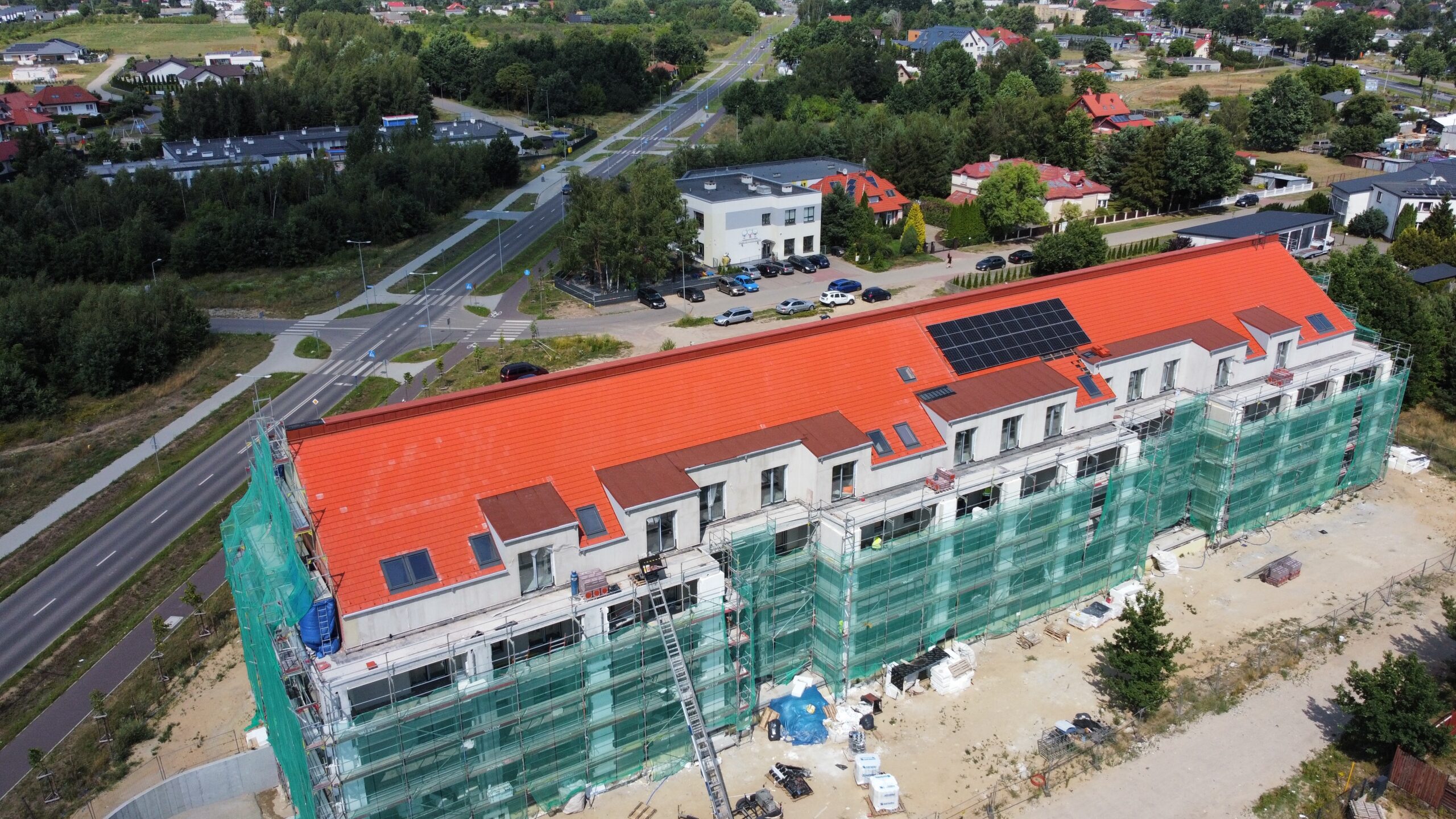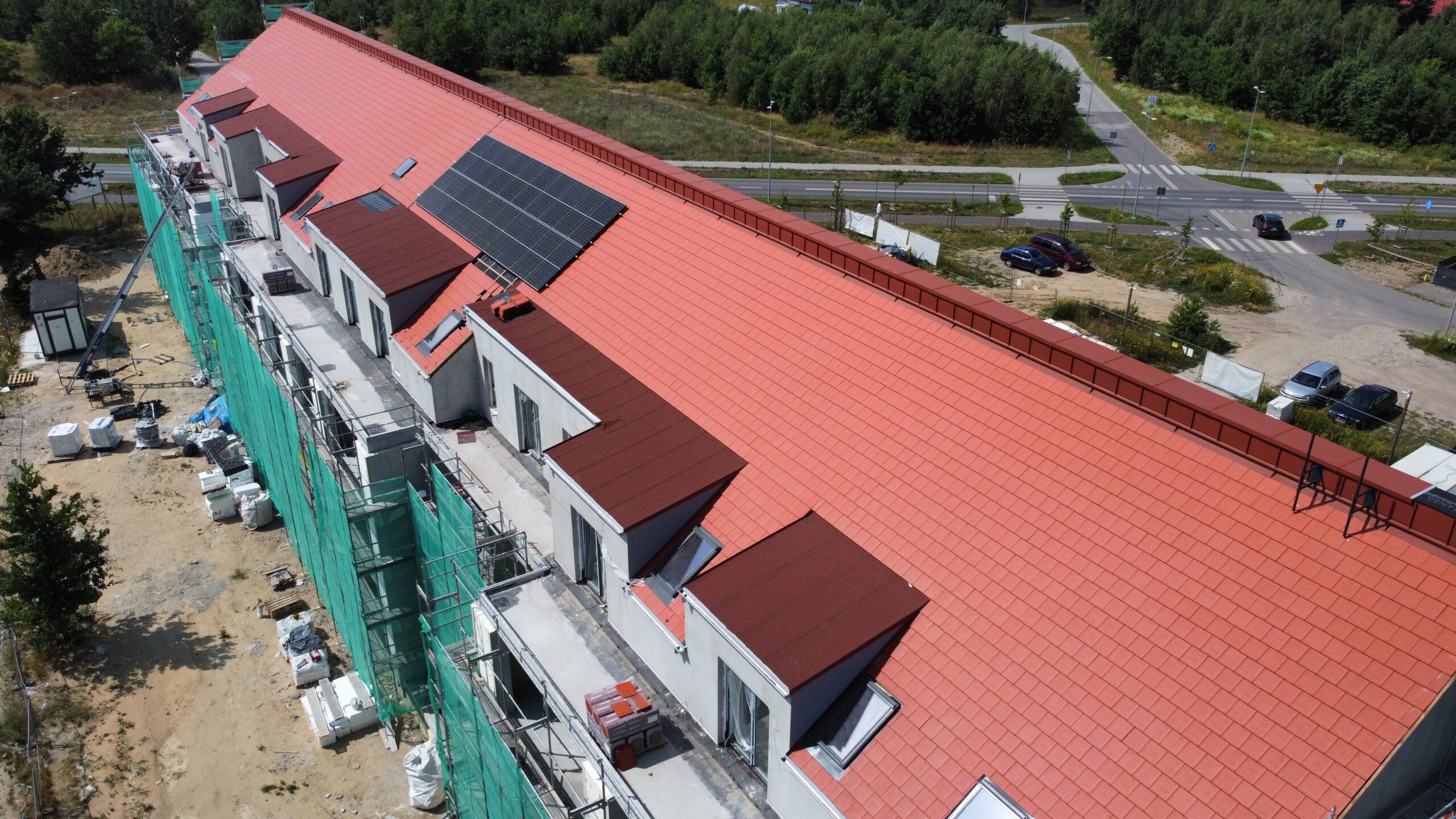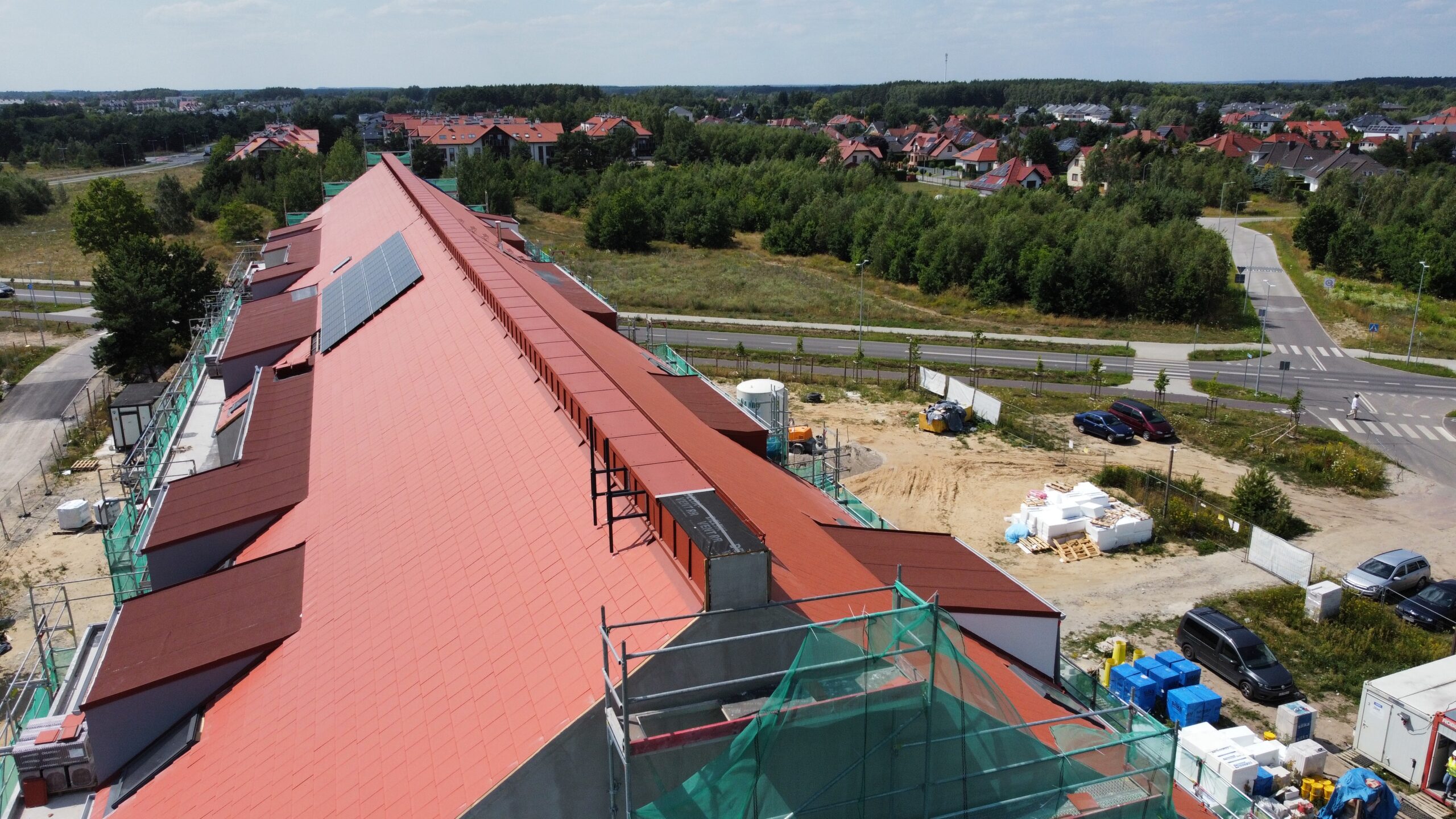 Prace przy montażu pokrycia dachowego są na ostatniej prostej. Niebawem cały dach pokryty zostanie czerwoną dachówką i fotowoltaiką.