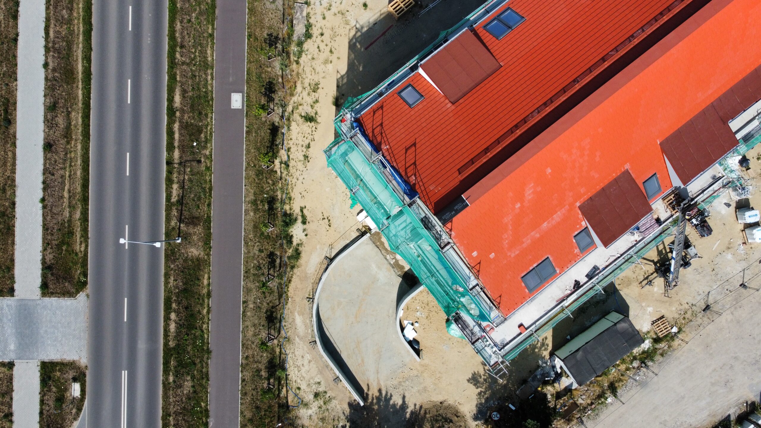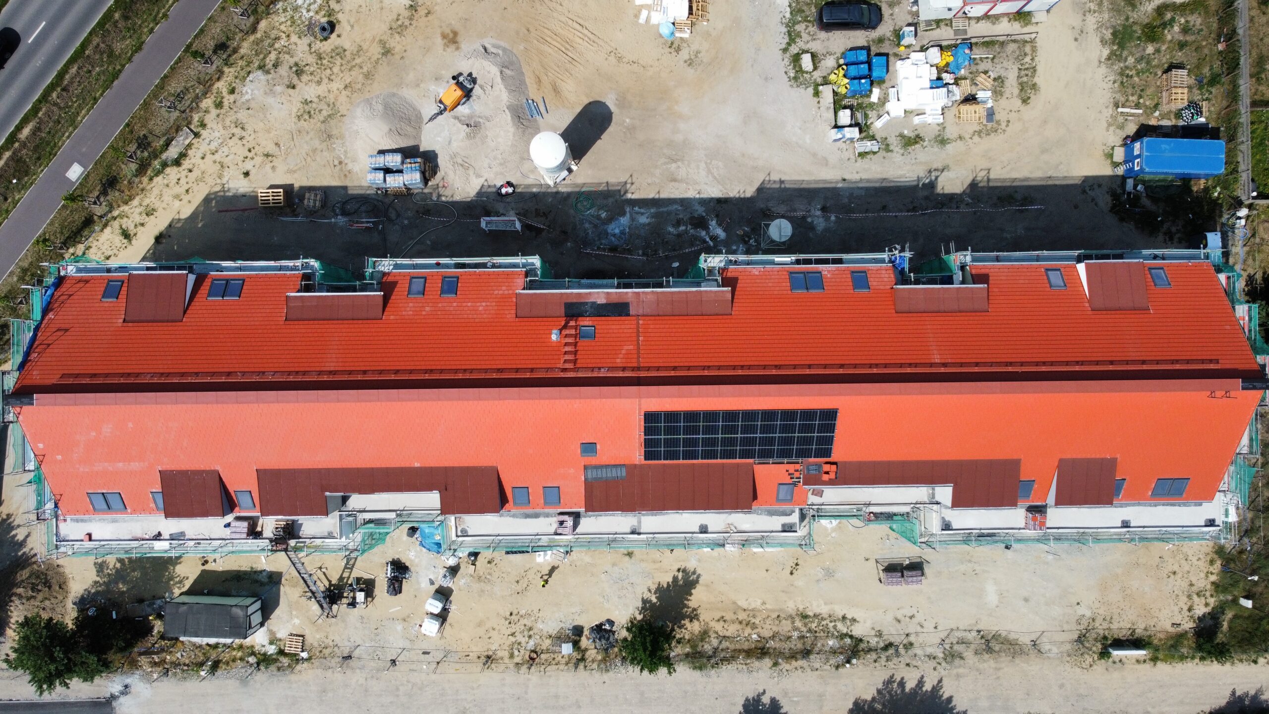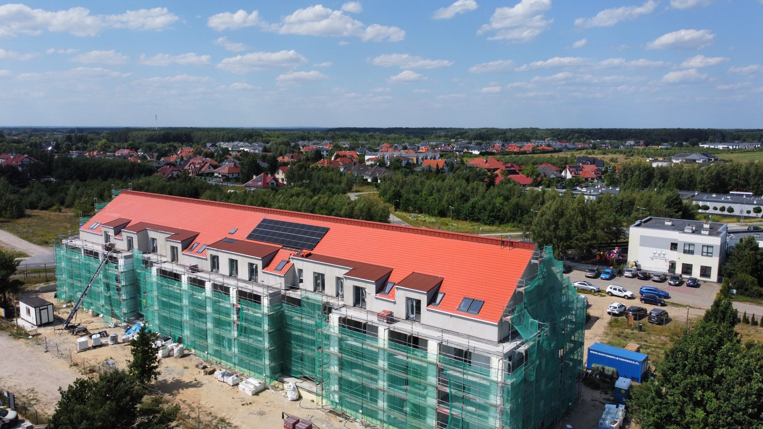 Prace przy montażu pokrycia dachowego są na ostatniej prostej. Niebawem cały dach pokryty zostanie czerwoną dachówką i fotowoltaiką.
