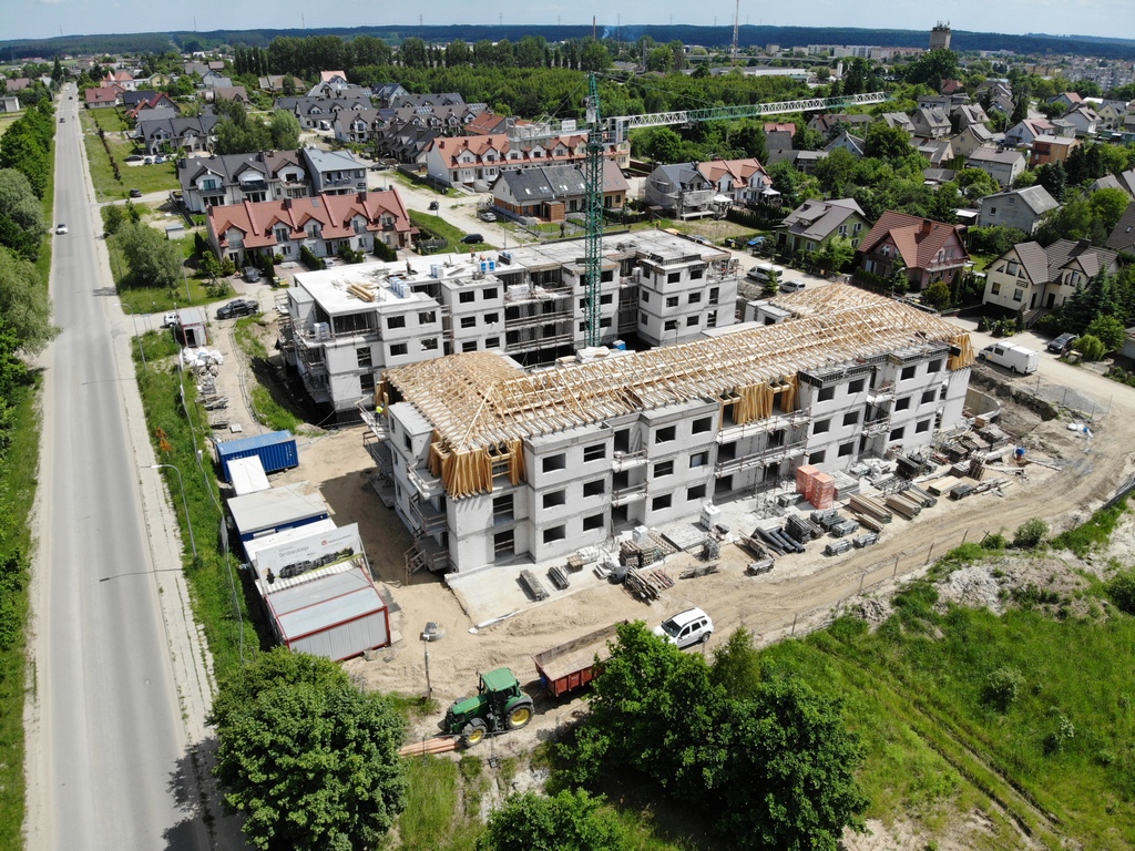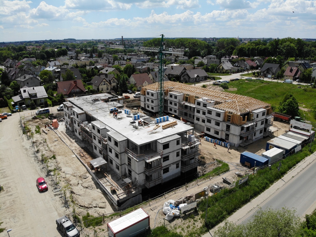 Wielkimi krokami zbliżamy się do zakończenia etapu wykonywania konstrukcji obu budynków. Niebawem na dachu Apartamentów Derdowskiego zawiśnie symboliczna wiecha. Jednocześnie budowa przygotowuje się do rozpoczęcia prac wykończeniowych. Na efektownym dachu mansardowym dekarze pracują nad pokryciem.