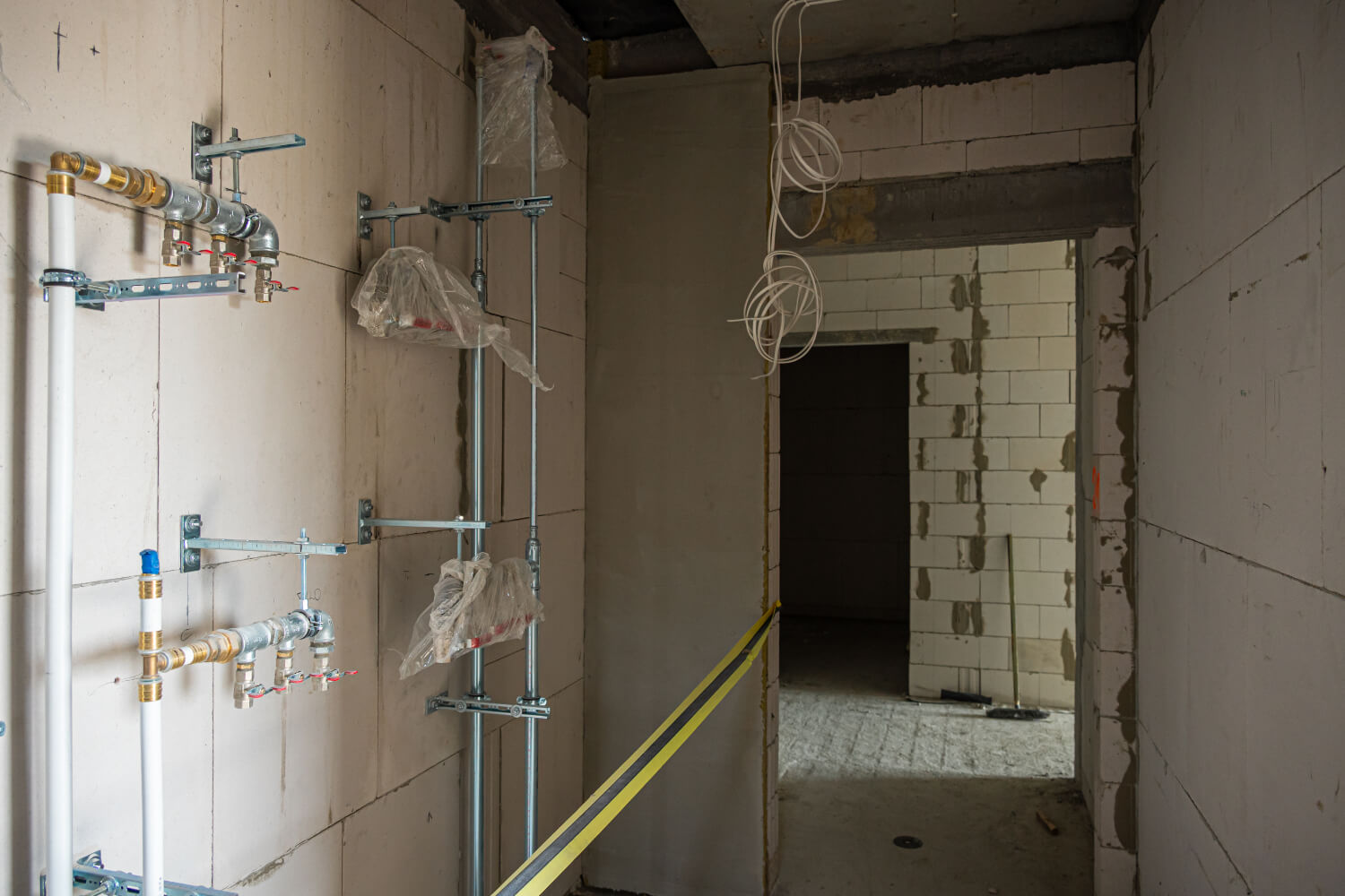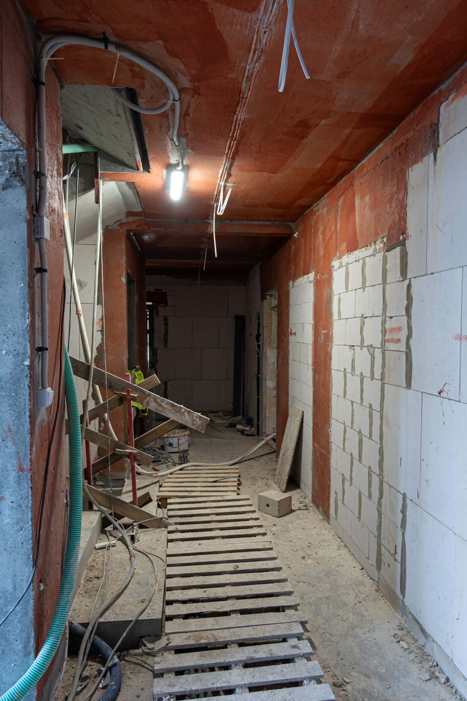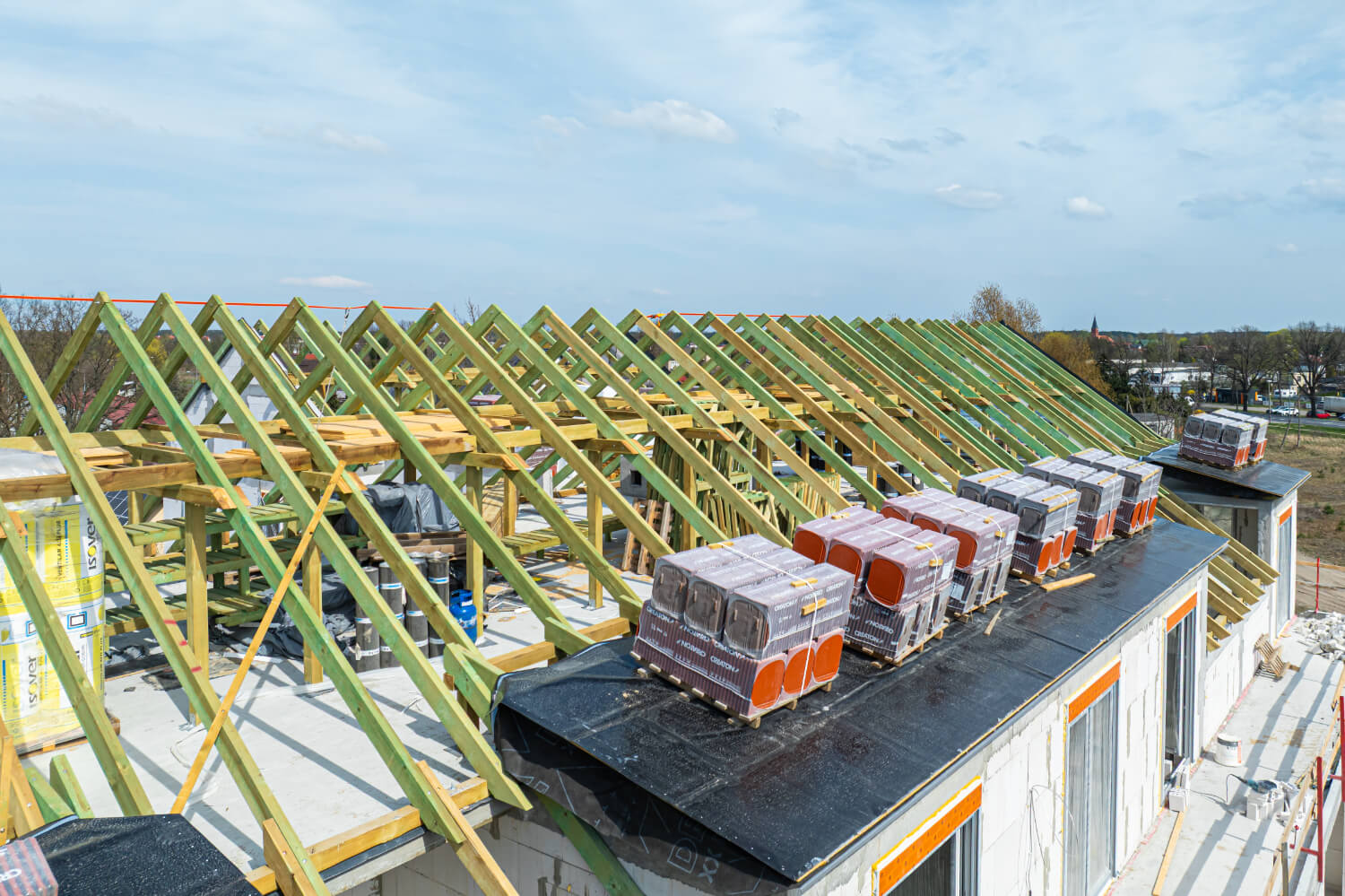 Aktualnie trwają prace nad pokryciem dachu dachówką ceramiczną oraz instalacjami wewnętrznymi i tynkami.